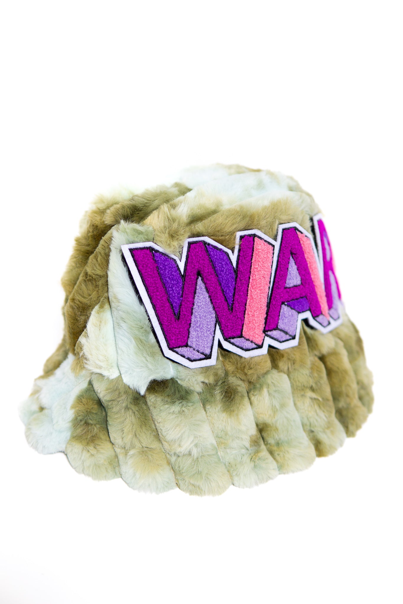 Inspired by the internal WAR between evolution and old learned behaviors rooted in fear and oppression the A Universe WAR Modular hat features a 9 in chenille embroidered Velcro patch embellished against a plush faux fur bucket. The hat has circumference of 22 inches and has an adjustable draw strings.